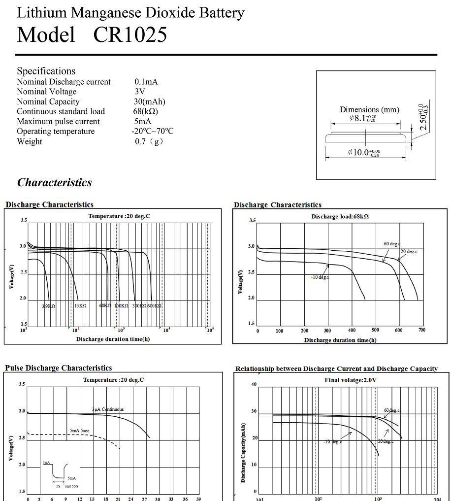 Li-MnO2 Coin Battery CR1025,3V 30mAh,Temperature -20℃ ~ +70℃