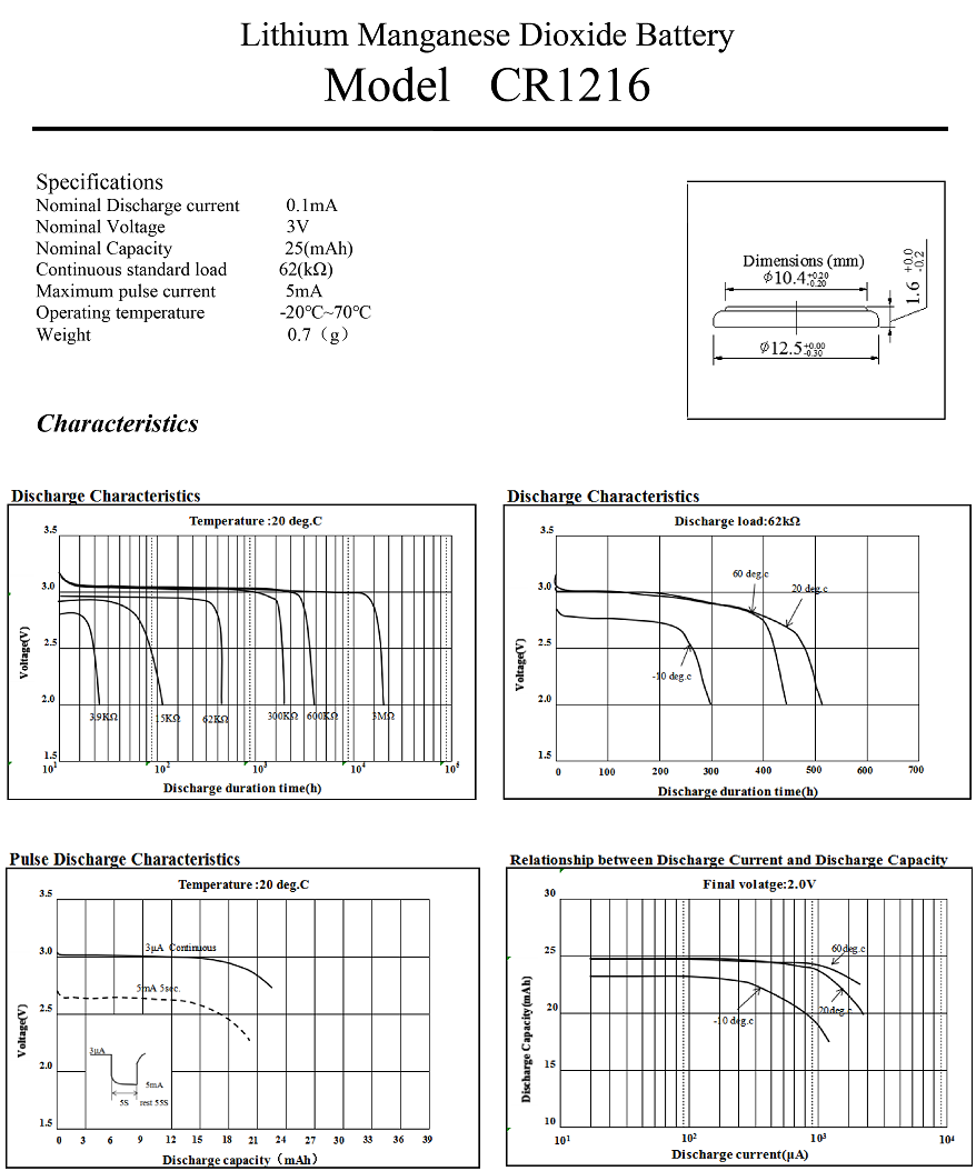 Li-MnO2 Coin Battery CR1216,3V 25mAh,Temperature -20℃ ~ +70℃