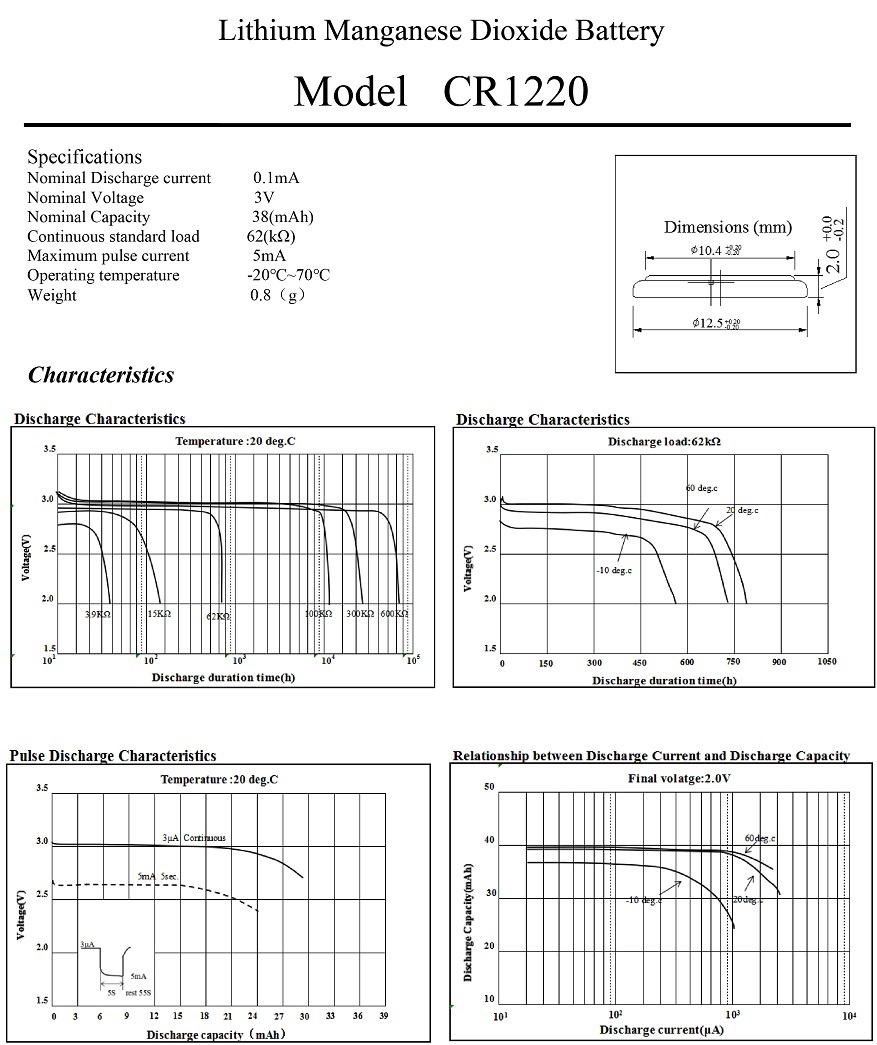 Li-MnO2 Coin Battery CR1220,3V 38mAh,Temperature -20℃ ~ +70℃