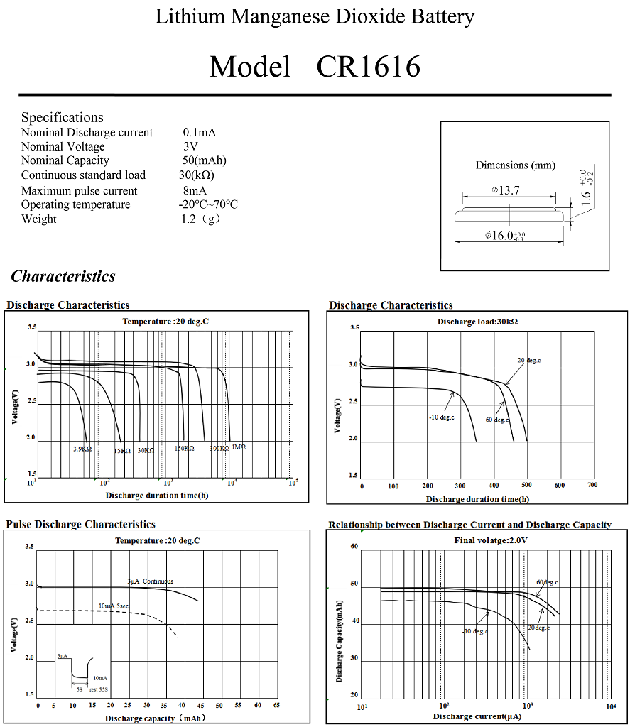 Li-MnO2 Coin Battery CR1616,3V 50mAh,Temperature -20℃ ~ +70℃