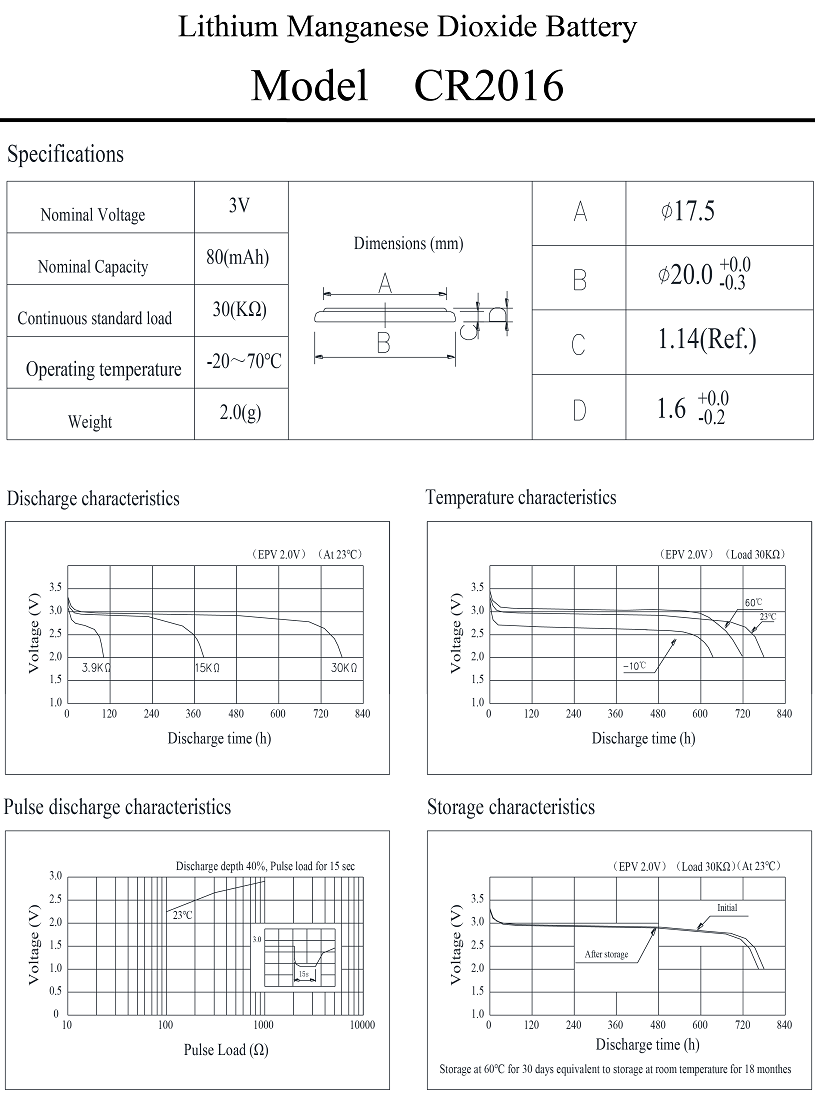 Li-MnO2 Coin Battery CR2016,3V 80mAh,Temperature -20℃ ~ +70℃