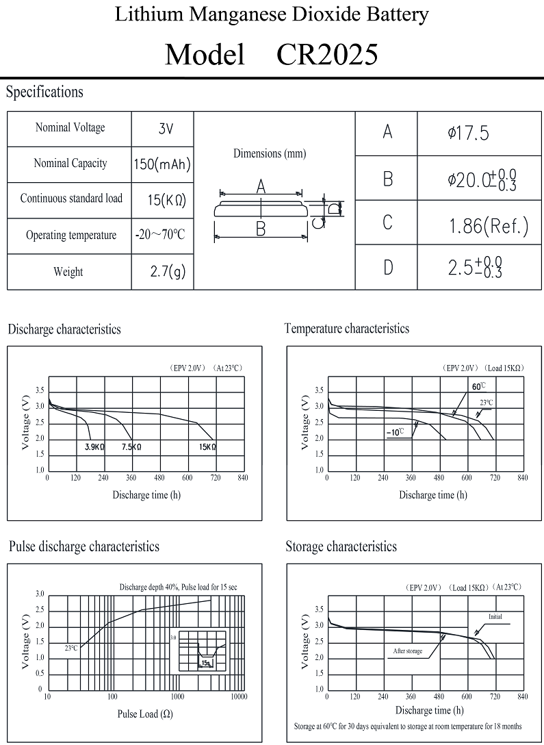 Li-MnO2 Coin Battery CR2025,3V 150mAh,Temperature -20℃ ~ +70℃