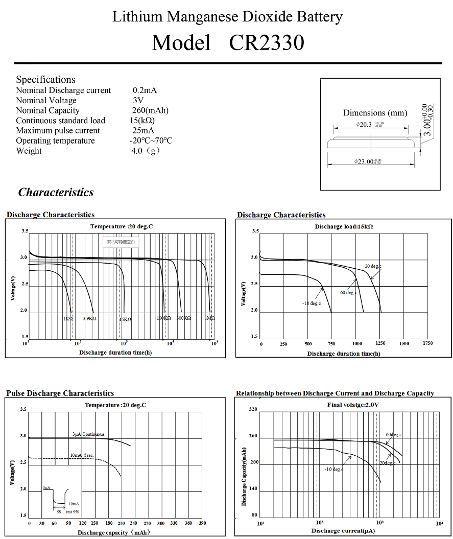 Li-MnO2 Coin Battery CR2330,3V 260mAh,Temperature -20℃ ~ +70℃
