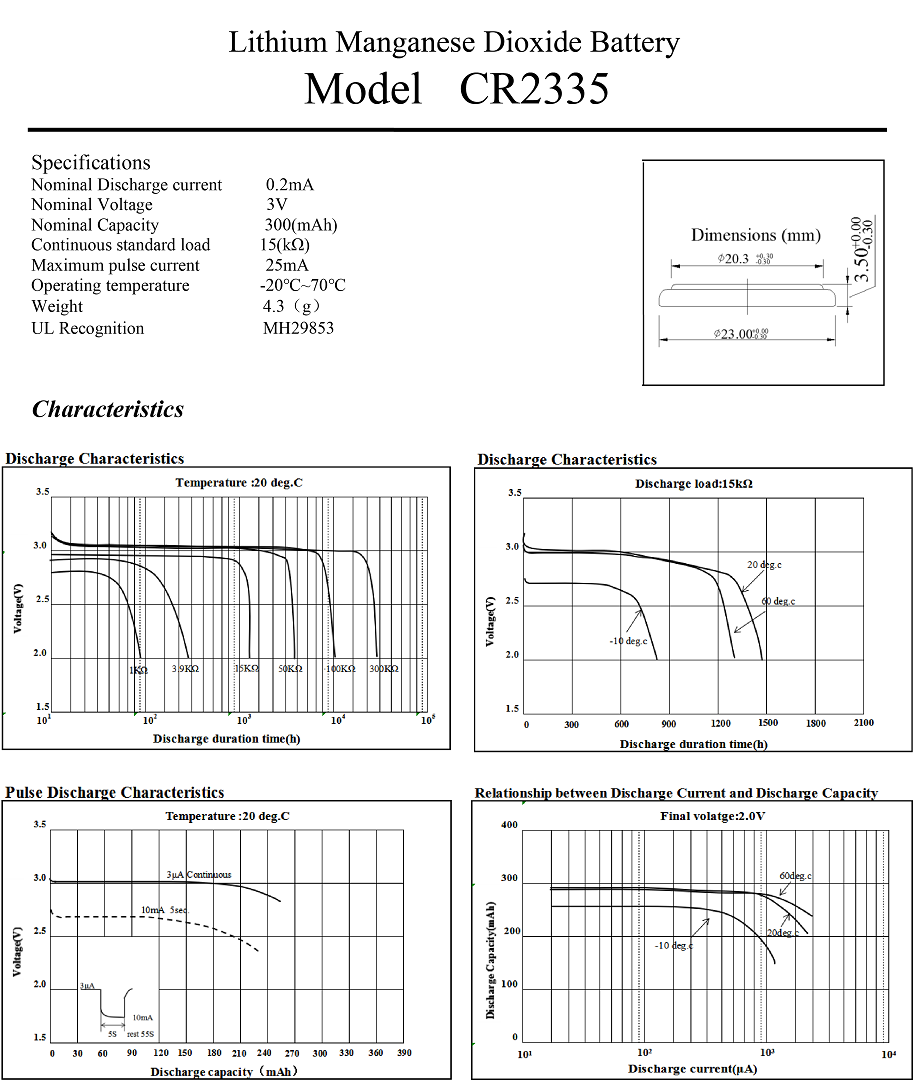 Li-MnO2 Coin Battery CR2335,3V 300mAh,Temperature -20℃ ~ +70℃