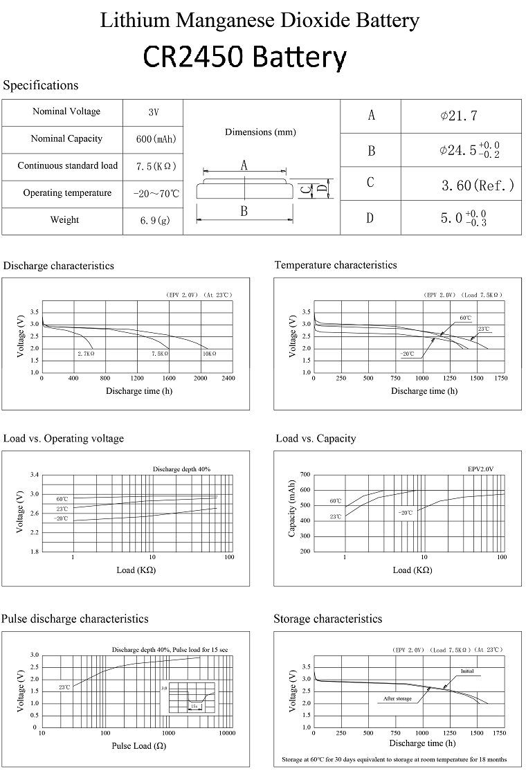 Li-MnO2 Coin Battery CR2450,3V 600mAh,Temperature -20℃ ~ +70℃