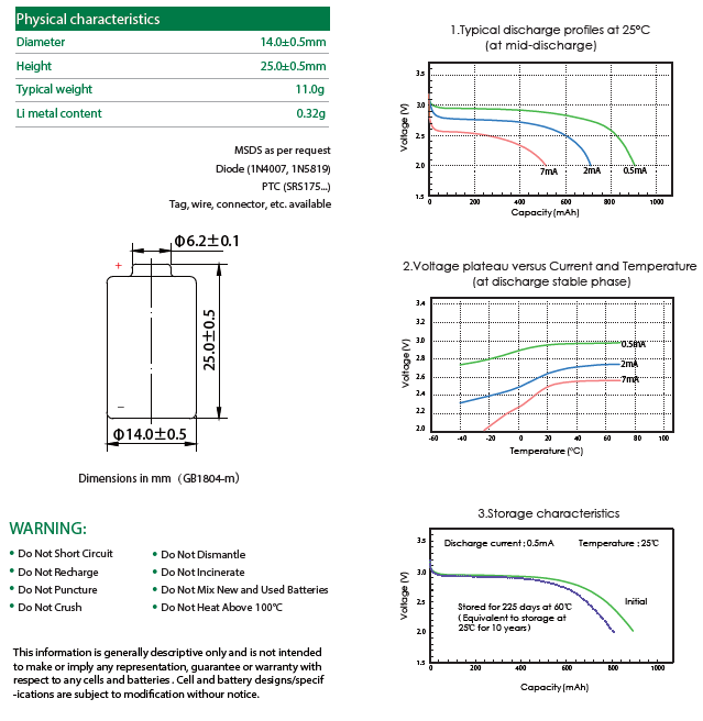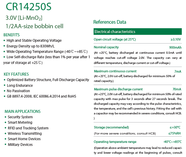 Hermetically Sealed Bobbin Type 900mAh 3.0V Lithium Manganese Dioxide [Li-MnO2] 1/2AA-size CR14250S Lithium Battery 1:The energy density is up to 260Wh/kg