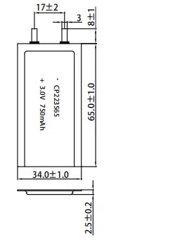 Lithium manganese pouch battery,Size 2.5*34.0*65.0mm,3V 750mAh,Temperature -20℃ ~ +70℃ KLS5-04-CP223565 |