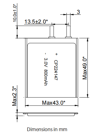 Lithium manganese pouch battery,Size 2.3*43.0*49.0mm,3V 800mAh,Temperature -20℃ ~ +70℃ KLS5-04-CP224147 |