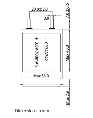 Lithium manganese pouch battery,Size 2.6*38.0*43.0mm,3V 700mAh,Temperature -20℃ ~ +70℃ KLS5-04-CP243742 |