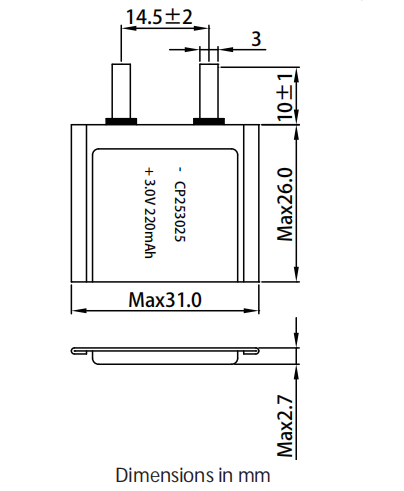 Lithium manganese pouch battery,Size 2.7*31.0*26.0mm,3V 220mAh,Temperature -20℃ ~ +70℃ KLS5-04-CP253025 |