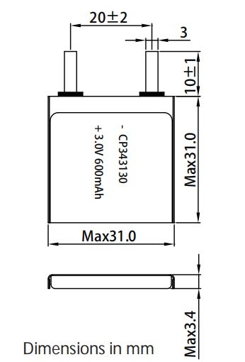 Lithium manganese pouch battery,Size 3.4*31.0*31.0mm,3V 600mAh,Temperature -20℃ ~ +70℃ KLS5-04-CP343130 |