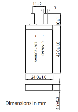 Lithium manganese pouch battery,Size 5.0*25.0*43.0mm,3V 1200mAh,Temperature -20℃ ~ +70℃ KLS5-04-CP502440 |