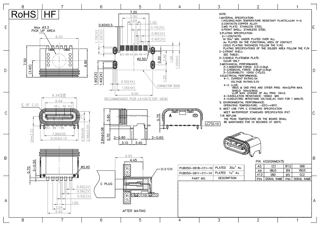 SMT USB Type-C 24P IPX8 Waterproof Connector