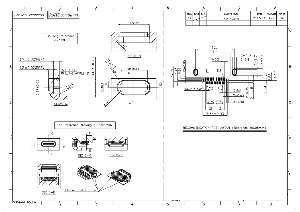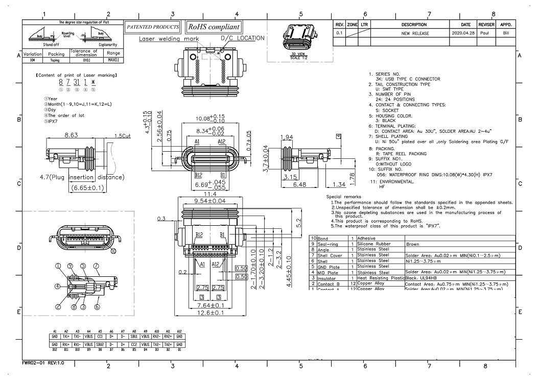 SMT USB Type-C 24P IPX8 Waterproof Connector